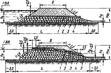 где hд - мощность деятельного слоя, м; lл - расстояние от поверхности вечномерзлого грунта до верха слоя льда, м; hтin - 2,0 м для дорог I и II категорий; 1,2 м - для дорог III и низших категорий. Из всех получаемых значений, ограничивающих минимальную высоту насыпи, необходимо принимать большую величину. 3.42. В случаях существенного нарушения или удаления растительно-мохового покрова, а также в пределах тех участков трассы, где возможно нарушение естественного режима поверхностной воды, способствующее образованию водоемов в непосредственной близости от земляного полотна и возникновение необратимого и неуправляемого процесса термокарста, необходимо предусматривать противодеформационные мероприятия, в том числе поперечный пропуск поверхностной воды согласно обязательному приложению 10, разрабатываемые с учетом результатов прогнозирования изменений местных мерзлотно-грунтовых, гидрологических и других природных условий. 3.43. В пределах участков залегания подземного льда непосредственно под деятельным слоем, когда по техническим или экономическим соображениям высоту насыпи назначают менее норм, установленных п. 3.23, следует предусматривать полное или частичное удаление льда из основания насыпи с заполнением траншеи после удаления льда местным грунтом, удовлетворяющим нормативным требованиям, применительно к рис. 7. В проекте должны быть даны указания относительно производства работ в зимнее время по устройству траншеи и ее засыпке, а также о послойном уплотнении грунта при засыпке траншеи до норм, установленных для тела насыпей. Если сумма мощности деятельного слоя в естественных условиях и высоты насыпи будет равна или превысит 4 м, подземный лед разрешается не удалять, а насыпь проектировать в соответствии с требованиями, перечисленными в п. 3.39. Рис. 7. Схема устройства насыпи над подземным льдом, залегающим на глубине, равной мощности деятельного слоя: 1 - подземный лед; 2 - засыпка местным глинистым грунтом; 3 - поверхность вечномерзлого грунта в естественных условиях; hд - мощность деятельного слоя в естественных условиях