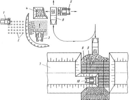 где hпсп - глубина потенциального сезонного промерзания грунтов, принимаемая по данным многолетних наблюдений или результатам теплотехнических расчетов; hот - глубина протаивания деятельного слоя к моменту начала отсыпки насыпи пониженной высоты, определяемая в период изысканий или принимаемая но данным многолетних наблюдений за глубиной промерзания и оттаивания грунтов деятельного слоя; k3 - коэффициент запаса, учитывающий вероятностный характер величин параметров, учитываемых расчетом (температуры воздуха и грунта, глубины деятельного слоя, типа грунтов и др.); его величину можно принимать в пределах от 0,6 до 0,9. 3.273. Зимнее промораживание грунтов основания полотна может быть применено: при строительстве водопропускных труб с целью понижения температуры вечномерзлых грунтов основания до величины, предусмотренной проектом. При строительстве трубы в летнее время возведение прилегающих к трубе участков и засыпку трубы следует осуществлять на высоту, определяемую по формуле (9), с досыпкой их до проектных уровней после промерзания грунтов основания под насыпью и фундаментом трубы в течение первого зимнего периода; в местах размещения фильтрующих насыпей и берм; при возведении неотапливаемых зданий различного назначения на подсыпках; в случаях заанкеривання в вечномерзлых грунтах фундаментов различных опор, в том числе с последующим покрытием теплоизоляционными материалами. 4. СТРОИТЕЛЬСТВООбщие требования4.1. Мероприятия по организационно-технической подготовке строительства следует выполнять с учетом: природных условий района; принятых в проекте принципов использования вечномерзлых грунтов в качестве основания зданий и сооружений; необходимости оснащения строительства транспортом, строительными машинами, механизмами и специальными установками, приспособленными для разработки вечномерзлых грунтов, в условиях низкой температуры воздуха и сильных ветров (в том числе в «северном исполнении»); особенностей заготовки и складирования необходимых запасов топлива, строительных материалов и изделий; необходимости заготовки теплой одежды и специальных средств против обмораживания рабочих и технического персонала в зимний период, а также защиты от комаров, мошки и энцефалитного клеща в летний период. 4.2. В районах с большими снегозаносами защита автозимников и уложенного рельсового пути может осуществляться путем установки щитов и заборов, а очистка - снегоочистителями плужного и роторного типов. К зимнему периоду должны быть подготовлены: средства круглосуточного освещения строительной площадки и рабочих мест; помещения для обогрева рабочих; средства для борьбы со снежными заносами и наледями; фронт работ для рабочих всех квалификаций. ЗЕМЛЯНЫЕ РАБОТЫОбщие указания4.3. Земляное полотно можно возводить до проектных отметок в один или в два этапа. Способ организации работ по возведению земляного полотна следует принимать на основе результатов технико-экономического сравнения вариантов в зависимости, главным образом, от директивных сроков строительства и обеспеченности строящейся линии грунтами, пригодными для отсыпки насыпей. 4.4. При двухэтапной организации работ на первом этане насыпи требуется отсыпать по пониженному продольному профилю, преимущественно из местных грунтов с соблюдением нормативн
