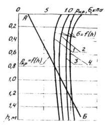 Рис. 1. Распределение по глубине h критической нагрузки ркр и напряжений в грунте σ : 1 - при четырехосных вагонах с осевой нагрузкой 22 т/ось; 2 - то же, с осевой нагрузкой 25 т/ось; 3 - при восьмиосных вагонах с осевой нагрузкой 22 т/ось; 4 - то же с осевой нагрузкой 25 т/ось Необходимая толщина дренирующей подушки в пределах основной площадки земляного полотна находится по пересечению линии АВ и кривых распределения суммарных напряжений для заданных условий эксплуатации. 5.5. Прочностные характеристики (сцепление, угол внутреннего трения) должны соответствовать состоянию, в котором находится грунт расчетного слоя в период оттаивания. В зависимости от влажности и прочности грунта по глубине расчетом получают глубину вырезки и соответствующую толщину дренирующей подушки. В качестве примера на рис. 2 приведены результаты расчетов глубины вырезки по трем вариантам сочетаний влажности W и прочностных характеристик оттаивающего грунта основания: 1. Wр = 29 %; с = 0,05 кгс/см2 (105 Па); φ = 14° 2. Wр = 25 %; с = 0,10 кгс/ см2 (105 Па); φ = 18° 3. Wр = 21 %; с = 0,13 кгс/ см2 (105 Па); φ = 19° Принимая минимальную