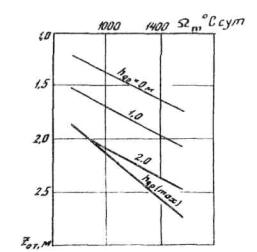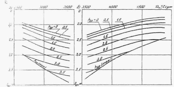 5.11. Аналоговую глубину примерзания-оттаивания на участках с несливаюшейся мерзлотой и глубоким сезонным промерзанием - оттаиванием следует определять в конце зимы; на участках со сливающейся мерзлотой - в конце осени, с измерением одновременно толщины hi каждой разновидности грунтов и материалов. 5.12. Эквивалентная глубина промерзания - оттаивания эталонного грунта (суглинка тяжелого, глины) может быть определена расчетным путем по известным апробированным методам, в частности с использованием номограмм рис. 3 и 4 (при hgp = 0). 5.13. Эквивалентную глубину промерзания - оттаивания с использованием номограмм (см. рис. 3 и 4) определяют по формулам: