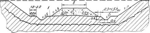 При замене пучинистого грунта на таких участках рекомендуется уширять мелкие выемки (рис. 9), применять в глубоких выемках, в том числе на крутых косогорах, лотки специальной конструкции или дренажи (рис. 10, 11). Проектное решение следует принимать с учетом местных мерзлотно-грунтовых условий, результатов соответствующих теплофизических, технико-экономических расчетов. Крутизну и способ укрепления откосов рекомендуется назначать по результатам расчетов на устойчивость с учетом состояния и свойств грунта в естественных условиях и после разработки выемки. Для обеспечения устойчивости откосов выемок в глинистых и других нескальных льдонасыщенных грунтах можно предусматривать покрытие откосов крупнообломочными или песчаными грунтами (см. рис. 11). 5.27. В случаях, когда под основной площадкой выемок локально залегают неоднородные, в том числе пучинистые, грунты, целесообразно предусматривать местную вырезку и замену грунтов с устройством плавных концевых сопряжений (см. рис. 6), а при наличии водоносной песчаной линзы требуется предусматривать устройство дренажа для перехвата и отвода воды. Рис. 7. Схема устройства сопряжений насыпи с устоем моста: 1 - поперечный дренаж Рис. 8. Схема устройства сопряжений насыпи из пучинистых