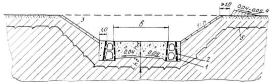 грунтов на участке водопропускной трубы 1 при высоте насыпи менее 5.28. В пределах концевых участков выемки, сложенных глинистыми или пучинистыми крупнообломочными грунтами с глинистым заполнителем, а также низких насыпей на подходах к выемкам, следует предусматривать вырезку пучинистых грунтов основания (рис. 12). Длину участка сопряжения выемки с насыпью в этом случае можно определять по формуле (24). 5.29. Основную площадку выемок в скальных легковыветривающихся породах (аргиллитах, алевролитах, сланцах и др.), переходящих в результате выветривания в глинистые грунты, следует проектировать с заменой этих пород, учитывая их свойства после выветривания. При этом толщину зоны выветривания рекомендуется принимать равной 0,75 глубины сезонного промерзания от верха балластной призмы. 5.30. Полувыемки-полунасыпи в пучиноопасных грунтах, создающих особо резкую неоднородность мерзлотно-грун-товых условий по поперечному сечению, проектировать не рекомендуется. Более целесообразными в таких случаях являются выемки с заменой пучинистых грунтов основания дренирующими (рис. 13). Рис. 9. Схема мелкой выемки в пучинистых грунтах с разработкой ее под насыпь: hQC - расчетная величина осадки вечномерзлого грунта основания при формировании деятельного слоя 1 Рис. 10. Схема глубокой выемки в пучинистых грунтах: 1 - железобетонная рама лотка; 2 - железобетонные плиты с отверстиями; 3 - укрепление откосов; 4 - банкет из местного грунта; 5 - поверхность вечномерзлого грунта Рис. 11. Схема выемки в