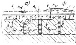 Расчет толщины дренирующей подушки по условию обеспечения несущей способности ее основания5.3. Расчет толщины дренирующей подушки земляного полотна можно выполнять по условию обеспечения несущей способности основной площадки в соответствии с положениями «Рекомендаций по проектированию земляного полотна дорог в сложных инженерно-геологических условиях» (М., ЦНИИС, 1974) и «Рекомендаций по проектированию противодеформационных мероприятий на участках весенних просадок пути» (М., Транспорт, 1982). Расчетное состояние грунта при этом принимается на периоды его оттаивания. Для предотвращения возможности возникновения деформаций пластических сдвигов в верхней части толщи оттаивающего грунта должно быть выполнено условие равенства критической нагрузки ркр на грунт (несущей способности) и суммарного напряжения σ от поездной нагрузки и собственного веса грунта*. Для расчета можно
