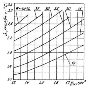 где Wом - оптимальная влажность глинистого заполнителя, определяемая при стандартном уплотнении согласно СН 449-72; Wк - влажность крупных частиц в долях единицы, определяемая в соответствии с «Инструкцией по возведению грунтовых противофильтрационных устройств плотин в северной строительно-климатической зоне» (М., изд. Гидропроекта им. С.Я. Жука - МИСИ им. В.В. Куйбышева, 1979); р - содержание крупных частиц в долях единицы. 2.6. Максимальную стандартную плотность крупнообломочных грунтов γmaxк рекомендуется определять опытным путем или по данным стандартного уплотнения только глинистого заполнителя с пересчетом ее на весь объем крупнообломочного грунта по формуле