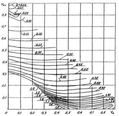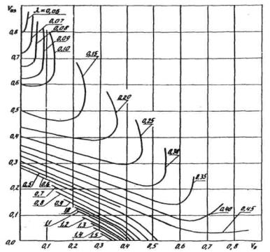 где γМ - плотность скелета сухого заполнителя, кг/м3 . Значение коэффициента теплопроводности торфов и эаторфованных грунтов рекомендуется определять по номограммам (см. справочное приложение приложение 2, рис. 7 и 8) в зависимости от объемного содержания в них воды и воздуха. Объемное содержание воды в торфе Vв находится из соотношения