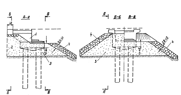 Рис. 3. Схема обсыпки конуса насыпи столбчатого устоя камнем: 1 - устой; 2 - граница обсыпки; 3 - конус насыпи; 4 - каменная обсыпка Приложение