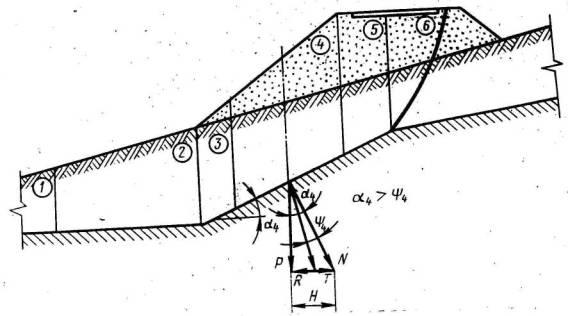 Рис.1. Схема к оценке устойчивости склона по методу горизонтальных сил (метод Маслова-Берера) Далее в сторону скольжения отсека откладывают угол сопротивления сдвигу: