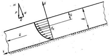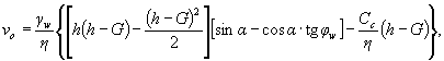 где Fр - коэффициент сопротивления сдвигу. Под этим углом проводят линию до пересечения с направлением силы Н, получают силу Е и силу Т. При практическом использовании метода горизонтальных сил напряжение р определяют по "гидростатическому принципу": р = gw·h, (13) где gw - объемный вес грунта; h - средняя высота расчетного блока. Фильтрационное давление грунтовых вод Wфi учитывают в условиях плоской задачи по выражению Wфi = Dв · Ji · wi (14) где Dв - объемный вес воды; Ji - гидравлический градиент, действующий в пределах расчетного блока; wi - площадь сечения выделенного расчетного блока. Расчет по деформируемости (2-е предельное состояние) 61. Для оценки скорости смешения поверхности оползневого (рис.2) склона vo может быть использована формула где h - мощность слоя смешения; G - "мертвая" зона, характеризуемая постоянством скорости ползучести и представляющая собой блок породы, смещающийся на слое грунта мощностью (h - G); gw - объемный вес грунта; jw, Cc - угол внутреннего трения и структурное сцепление соответственно; h - коэффициент динамической вязкости грунта.