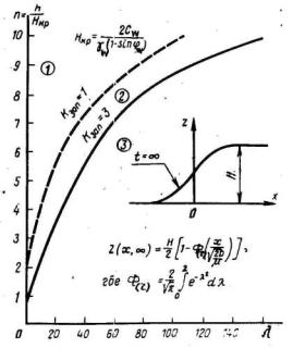 где l - параметр, зависящий от упруго-вязких свойств глинистого грунта; ф(τ) - интеграл вероятности, определяемый по табл.1 приложения 2. 70. В зависимости от величины параметров n и l возможны три основных случая состояния откоса земляного полотна: а) нарушение общей устойчивости откоса в результате потери прочности грунта (Кзап < 1); б) общая устойчивость откоса по прочности обеспечена (Кзап = Kтреб), однако не исключены деформации его ползучести; в) обеспечена общая устойчивость откоса по прочности, и отсутствуют деформации ползучести. Предварительно состояние откоса по степени его устойчивости оценивают по графику n = f(l) (рис.6). Кривая (1) соответствует коэффициенту общей устойчивости, равной единице (Кзап = 1), а кривая (2) отвечает случаю, когда практически отсутствуют деформации ползучести. 71. В случае, когда точка пересечения значений n и l (см. рис.6) попадает в область между кривыми (1) и (2), следует оценивать устойчивость откосов земляного полотна по деформируемости их во времени в результате ползучести грунта. При этом величину деформаций откосов насыпи во времени (рис.7) определяют
