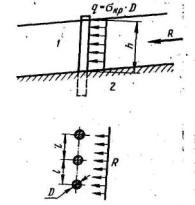 где Н - давление грунта при отсутствии трения и сцепления, Н = р·tga; R - непогашенная часть давления (активное давление), R = р·tg(a - yp); Т - часть общего давления, воспринимаемая трением и сцеплением в грунте, T = H - R = Q[tga - tg(a - yp)]. 82. Проектируемая свайная конструкция рассчитывается на величину активного оползневого давления R, при расчете определяют: а) давление на одиночную сваю; б) количество свай в конструкции; в) прочность сечения сваи; г) величину заделки сваи в устойчивые коренные породы. 83. Принимая, что активное оползневое давление распределяется равномерно между рядами свай и сваями в ряду, а эпюра давления на одиночную сваю носит равномерно распределенный характер по высоте ее в пределах оползневой толщи, величину оползневого давления, воспринимаемого одиночной сваей, следует определять по формуле qсв = sкр·d·h, (28) где d - диаметр сваи, м; h - мощность оползневых накоплений в месте установки свайного ряда, м; sкр - критическое удельное давление, определяемое зависимостью вида