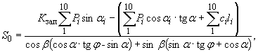 где Рi - вес блока; ai - угол наклона касательной к поверхности скольжения блока к горизонту; j - угол внутреннего трения грунта; ci - сцепление грунта; li - длина дуги скольжения; i - номер блока; a - угол наклона касательной к поверхности скольжения оползня к горизонту в месте установки анкерной затяжки; b - угол наклона анкерной тяги к вертикали; Кзап - коэффициент запаса устойчивости. После определения величины S0 назначают количество и места размещения анкерных затяжек в плане откоса или склона. Обычно анкерные затяжки располагают в 2-3 ряда в шахматном порядке. При расчете количества анкерных плит и их размеров в плане следует исходить из величины удельной нагрузки на грунт оползневого массива, которую можно допустить с учетом его физико-механических свойств. Величину удельной безопасной нагрузки Рбез , при которой отсутствуют зоны предельного состояния в основании плиты, можно определить по формуле