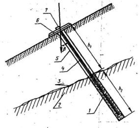 Рис.10. Схема к проверке свайной удерживающей конструкции на возможность переползания ее грунтом оползневого массива Анкерные конструкции89. Анкерные конструкции типа анкерного корсета относятся к противооползневым удерживающим сооружениям. Анкерный корсет состоит из одного или нескольких рядов анкерных затяжек, располагаемых поперек оползневого массива. Каждая анкерная затяжка в свою очередь состоит из трех элементов (рис.11): а) анкерной тяги, закрепляемой нижним (до плоскости скольжения оползня) концом в прочных устойчивых породах; б) анкерной плиты, укладываемой на поверхность оползневого массива над устьем скважины; в) верхнего анкера, с помощью которого анкерная тяга закрепляется в анкерной плите. 90. Статический расчет необходимого для укрепления оползня усилия в анкерной тяге производится с использованием какого-либо известного метода расчета устойчивости откосов или склонов. В том случае, если наиболее вероятной формой обрушения является обрушение со срезом и вращением, устойчивость откоса рассчитывают по методу круглоцилиндрической поверхности скольжения. После нахождения наиболее вероятной поверхности скольжения (рис.12) откос разделяется на две части. Одна его часть (заштрихованная), будет находиться в состоянии равновесия, а другая должна быть закреплена анкерными затяжками, так как сдвигающие силы вызывают ее вращение относительно точки "0". 91. Для определения размеров устойчивой части откоса может быть использовано следующее уравнение: s1·r1 = s2·r2 (41) где s1 - равнодействующая веса блока (АИК), расположенного слева от центра "0"; s2 - равнодействующая веса блока К и dc, расположенного справа от центра "0"; r1, r2 - плечи векторов s1 и s2. 92. Расчет необходимого усилия в анкерной затяжке основан на обеспечении равенства сдвигающих и удерживающих сил. При требуемом коэффициенте запаса устойчивости Кзап откоса необходимое усилие в анкерной тяге S0 можно определить по следующей формуле: