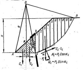 Расчет устойчивости природных склонов и откосов земляного полотна51. Степень устойчивости природных склонов (как с учетом земляного полотна, так и без него) должна оцениваться уже на предпроектной стадии ТЭО при выборе наиболее экономически и технически оправданного варианта проложения трассы. Наиболее подробный расчет устойчивости склонов производится на стадии разработки технического проекта применительно к выбранному варианту расположения земляного полотна после получения достаточно полных данных по инженерно-геологическому строению склонов и физико-механическим свойствам грунтов. 52. Устойчивость природного склона следует рассчитывать прежде всего исходя из наиболее вероятной формы нарушения его устойчивости (скол при просадке, срез с вращением, оползень-поток и т.п.) и обязательно применительно ко всему природному склону, а не к его локальной части, расположенной в зоне возведения земляного полотна. Для природного оползневого склона форма нарушения его устойчивости определяется наиболее просто по четким признакам, сопровождающим оползневую активность (стенки срыва, трещины растяжения, локальная заболоченность, валы выпирания и т.п.) и отделяющим оползневое тело от здоровой части склона. В случае, когда склон устойчивый или условно-устойчивый и трудно заранее с достаточной достоверностью определить наиболее вероятную форму нарушения его устойчивости, следует исходить из предполагаемой в данном случае формы деформации, принимая во внимание особенности геологического строения толщи склона и факторы, связанные со строительством автомобильной дороги (подсечка, перегрузка, разгрузка и т.п.). При этом следует выполнять проверочные расчеты для нескольких возможных схем. Наиболее вероятной схемой будет та, которая дает минимальную величину коэффициента запаса устойчивости. 53. Устойчивость склонов следует рассчитывать по поперечнику, в котором наиболее неблагоприятно сочетаются такие факторы, как крутизна склона, наличие ослабленных зон, мощность смещающихся грунтов и т.п. 54. Устойчивость склонов и откосов рассчитывают по двум предельным состояниям (плоская задача): а) по прочности (1-е предельное состояние); б) по деформируемости (2-е предельное состояние). 55. Расчет устойчивости откосов и склонов по прочности сводится к определению коэффициента запаса устойчивости Кзап и сравнению его с требуемой величиной. При этом коэффициент запаса устойчивости определяется как отношение суммы сил, удерживающих откос или склон в устойчивом состоянии, к сумме сил, нарушающих это состояние. Для расчета суммарного воздействия удерживающих сил при оценке величины Кзап используются прочностные характеристики грунта, а именно: его сопротивляемость сдвигу, определяемая силами внутреннего трения грунта jw и общего структурного сцепления Cw . 56. Устойчивость откосов и склонов по деформируемости следует рассчитывать, если обеспечена их устойчивость по прочности (Кзап > 1), но есть опасность развития длительных деформаций ползучести во времени. В этом случае дополнительно в качестве исходных характеристик грунта следует оценивать коэффициент динамической вязкости h. 57. Проверку устойчивости оползневых склонов по критериям деформируемости необходимо осуществлять особенно в тех случаях, когда угол внутреннего трения гру