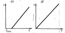 Рис.3. Зависимость скорости ползучести от касательного напряжения для скрыто-пластичных глинистых грунтов (а) и пластичных (б) 6. Исходя из зависимости v = f(t), определяется коэффициент динамической вязкости h: а) для скрытопластичных грунтов (рис.3,а) по формуле Бингама-Шведова