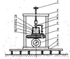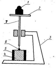 Рис.4. Прибор для испытания методом "шарика": Усовершенствованный метод "шарика" 1. Определение коэффициента вязкости глинистых грунтов по методу "шарика" проводится с помощью пенетрационного прибора, в котором нагрузка на стальной шарик передается с помощью динамометра (рис.5). 2. Предварительно подготовленный образец грунта (с нарушенной или ненарушенной структурой) устанавливается на площадку прибора, жестко соединенную с упругим элементом динамометра. По индикатору динамометра берется начальный отсчет Ро в единицах деформации упругого элемента динамометра.