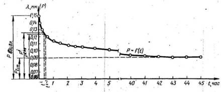 при котором скорость его погружения 5. По данным наблюдений строится график (рис.6) Р = f(t) где Р - усилие упругого элемента динамометра действующее на шарик, выраженное в единицах его деформации; t - время, сек. 6. На различных
