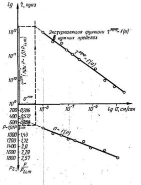 Рис.7. Зависимость эффективного коэффициента вязкости и нагрузки на шарик от скорости погружения шарика 9. Фиктивная плотность шарика gш определяется по формуле