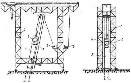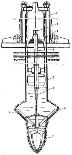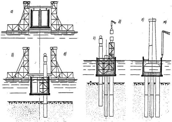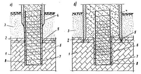 2.22. Для эстакад, путепроводов и временных сооружений, возводимых на несвязных грунтах при допускаемом размыве дна не более 1 м, целесообразно применять фундаменты из оболочек диаметром 1,6-2 м с несущей диафрагмой (рис. 4). Фундамент должен быть заглублен в грунт не менее чем на 2,5 диаметра оболочки. Несущую диафрагму в зависимости от плотности грунта следует располагать на 0,5-1 диаметр оболочки ниже естественной поверхности грунта, так как при вибропогружении фундамента вследствие уплотнения грунта происходит осадка последнего в полости оболочки.