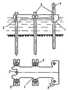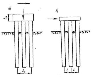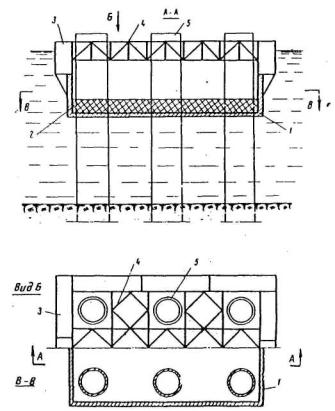 2.19. Для опор на мелководных реках следует, как правило, применять низкие ростверки с плитой, расположенной ниже горизонта ледохода (рис.1,а). При значительной глубине воды (свыше 5 м с учетом размыва) рекомендуется делать высокие ростверки (рис.1,б).