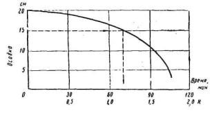 5. Результаты последовательных измерений осадки проб наносят на график (см. рисунок), по которому определяют величину показателя К, соответствующую точке, отсекаемой горизонталью, проведенной от осадки, равной 15 см.