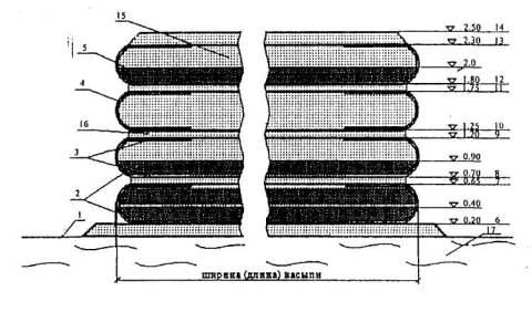 1. Поверхность выравнивающего слоя; 2. Замкнутая обойма; 3. Стеклоткань ТР-07; 4. Геотекстиль «Дорнит»; 5. Георешетка «Прудон-494»; 6. Верхняя поверхность искусственного основания; 7. Верхняя грань первой обоймы; 8. Нижняя грань второй обоймы; 9. Верхняя грань второй обоймы; 10. Нижняя грань третьей обоймы; 11. Верхняя грань третьей обоймы; 12. Нижняя грань четвертой обоймы; 13. Верхняя грань четвертой обоймы; 14. Отметка фундамента; 15. Заполнение песком обоймы; 16. Выравнивающий слой; 17. Торфрис. 1. Армогрунтовая насыпь на торфяном основании под буровую площадку