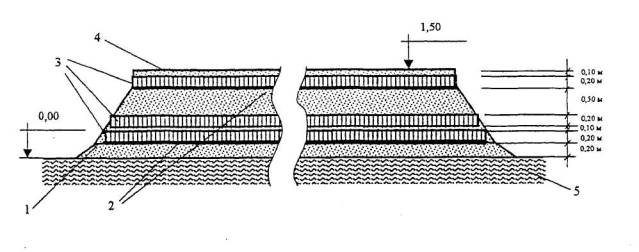 1. Поверхность выравнивающего слоя; 2. Геотекстиль «Дорнит»; 3. Георешетка «Прудон-494»; 4. Выравнивающий слой песка; 5. Торф. Рис. 2 Таблица 4