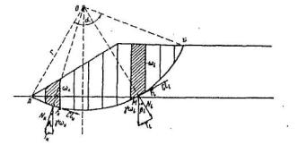 Рис.3.1. Схема разбивки на блоки поперечного сечения насыпи из однородных грунтов Для каждого блока можно изобразить его вес γωi, в виде вектора на поверхность скольжения откоса. Вектор веса γωi раскладывается на нормальную Ni и касательную Тi составляющие: Ni = γωi cosβi; Ti = γωisinβi Сила Тi вызывает смешение отсека, а составляющая Ni порождает силу трения Fi, удерживающую грунт от смещения. Fi = fNi. Здесь f - коэффициент внутреннего трения грунта, равный f = tgφ, где φ - угол внутреннего трения грунта. Препятствуют смещению грунта также силы сцепления сl, где с - удельное сцепление; l - длина кривой смещения