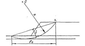 Для оценки устойчивости имеет значение критическая кривая смещения, т.е. такая кривая, при которой коэффициент устойчивости К имеет наименьшее значение. Задача состоит в том, чтобы найти такое положение поверхности скольжения, при котором коэффициент устойчивости минимален. То есть задача поиска коэффициента устойчивости сводится к решению оптимизационной задачи. Параметрами оптимизации при этом являются координата точки вращения и радиус поверхности круглого цилиндра. Радиус круглоцилиндрической поверхности скольжения и координаты ее центра однозначно определяются координатами ее точек пересечения с поверхностью земляного полотна (основания) и величиной стрелы стягивающей концы рассматриваемой потенциальной кривой скольжения (см схему рис. 3.3).