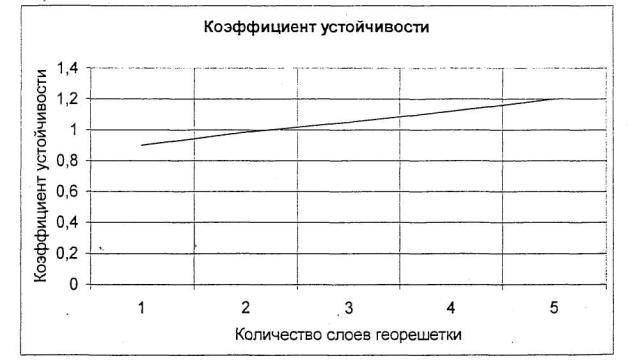 В табл. П.6 приведены результаты сравнения расчетов по МКЭ и по математической регрессионной модели. Регрессионная модель характеризуется следующими показателями: - Число степеней свободы = 12 - Средняя ошибка регрессии, % = 5,9 - Дисперсия адекватности =0,013 Для проверки прочности и устойчивости конструкции насыпи площадки были проведены расчеты коэффициента прочности по Мизесу для средних грунтовых условий основания, которые показали, что возможные зоны, где коэффициент прочности может оказаться <1, имеют ограниченный замкнутый характер и достаточно удалены от поверхности площадки. Эти данные позволяют рекомендовать при реальном проектировании ограничиться расчетами по предложенной методике и обращаться к более углубленным расчетам только в случаях существенно отличных природных условий (на глубинах болот более 6 метров, на болотах со сплавиной, при полном отсутствии дренирующих грунтов для отсыпки насыпи и т.п.). Порядок расчетов при проектировании конструкции насыпи. 1. Устанавливается необходимый коэффициент устойчивости. Как правило он должен быть в диапазоне 1,1 .. 1,25. 2. По графикам зависимости коэффициента устойчивости от количества слоев георешетки и консистенции основания определяют схему армирования. 3. По регрессионной математической модели определяют ожидаемую величину осадки (см. формулу). Для расчетов удобно использовать Microsoft Excel. Н = Fo - 0.1816*Х1 - 0.2237*X2 - 0.9353*Х3+ +0.2625*Х1*Х2+0.1615*Х1*Х3+0.2751*Х2*Х3+ +0.5821*Х32 4.Если величина ожидаемой осадки превышает допустимую, то следует изменить конструкцию и повторить расчет. 5 Собственные частоты колебаний насыпи, как показали расчеты, слабо зависят от параметров основания и определяются в основном физико-механическими свойствами грунта и армирования насыпи. Расчетные значения величины октав собственных частот колебаний насыпи, армированной георешеткой «Прудон-494» составили, Гц: