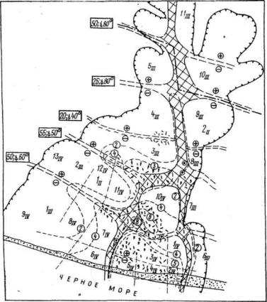 1 - зона дробления поперечного разрыва второго порядка; 2- линии продольных разрывов третьего порядка: а) достоверные; б) предполагаемые; 3 - линии продольных и поперечных разрывов четвертого порядка; 4 - структурно-тектонические блоки: арабская цифра- номер блока, римская цифра - порядок блока; 5 - граница раздела опускающейся и поднимающейся территорий; 6- знак относительного перемещения смежных тектонических блоков; 7 - цифры (слева направо): максимальная амплитуда относительного перемещения смежных тектонических блоков, угол наклона видимой поверхности сместителя; 8 - участки повышенной тектонической раздробленности коренных пород таврической серии; 9 - участки зон дробления разрыва с повышенным содержанием белых порошкообразных солей (гипс, тенардит); 10 - участки поглощения зонами тектонических разрывов (в породах таврической серии) подземных вод из оползневых накоплений; 11- участки подпитывания подземных вод оползневых накоплений водами повышенной минерализации, поступающими из зон дробления и трещиноватости тектонических разрывов; 12 - а) буровые скважины, б) точки вертикального электрозондирования, зафиксировавшие зоны дробления тектонических разрывов; 13 - изолинии равных величин минерализации подземных вод, вскрытых в коренных породах и смещенных блоках таврической серии; в кружочке величина минерализации, г/л; 14 - индекс оползневой системы: буква-группа системы, цифра - тип системы (в соответствии с типизацией оползневых систем ЮБК по тектоническим факторам оползнеобразования). ПРИЛОЖЕНИЕ 3ПОЛНАЯ СТРУКТУРНАЯ ФОРМУЛА ОПОЛЗНЕВОЙ СИСТЕМЫ