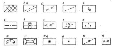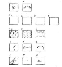 1- контур оползневого блока и его номер; 2- стенка срыва (ниша отрыва) блока; 3 - тип зоны выветривания, развитой в кровле блока (показывается разным цветом): а) первая зона выветривания - глина с полностью разрушенной текстурой материнских пород, б) вторая зона выветривания - мелкочешуйчатые аргиллиты с прослоями глин (с реликтами текстуры материнских пород), в) третья зона выветривания - мелкочешуйчатые аргиллиты, г) четвертая зона выветривания - мелкочешуйчатые аргиллиты с прослоями тонко-плитчатых; 4 - прослои в блоке: а) песчаника, б) алевролита; 5 - обводненные блоки; 6 - направление смещения блока: верхняя стрелка - первоначального, нижняя - современного; 7 - изогипсы кровли коренных пород; 8 - контур оползня; 9 - зоны тектонических нарушений; 10- буровые скважины; 11- индекс зоны оползневого смещения.