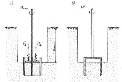 2.1.1.2. При испытаниях прочности грунтов под будущим сооружением по схеме (рис. 1), проводимых в забое шурфа или скважины, боковой пригрузкой служит масса грунта, залегающего вокруг выработки выше ее забоя.