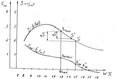 2.1.2.5. Если при сопоставлении (рис. 6) полученных в полевых условиях значений сопротивляемости сдвигу S¢ и показателя хрупкости F¢np с лабораторными данными S = f1(w) и Fnp= f2(w) значения S¢ и F¢np, окажутся на одной ординате (при этом S¢ # Swопт ) то грунт земляного полотна уплотнялся не при оптимальной влажности. При этом влажность грунта будет больше оптимальной W > Wonт,, если значение показателя хрупкости F¢np будет меньше его значения при оптимальной влажности. И наоборот, если значение F¢np. будет больше значения показателя хрупкости при оптимальной влажности, то влажность уплотненного грунта будет меньше оптимальной. Если при сопоставлении полученных в полевых условиях значений F¢¢np. и S¢¢ с лабораторными зависимостями S = f1(w)) и Fnp=f2(W) значения S¢¢ и F¢¢np. не окажутся на одной ординате, то грунты земляного полотна недоуплотнены.