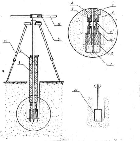 Для замера трения грунта по внешней поверхности крыльчатки, величина которого должна быть в дальнейшем исключена из показаний, прибор извлекается из грунта, крыльчатка с распределительным устройством, грузами и переходной муфтой снимаются со штанги, а на их место навинчивается специальный цилиндрический стакан.