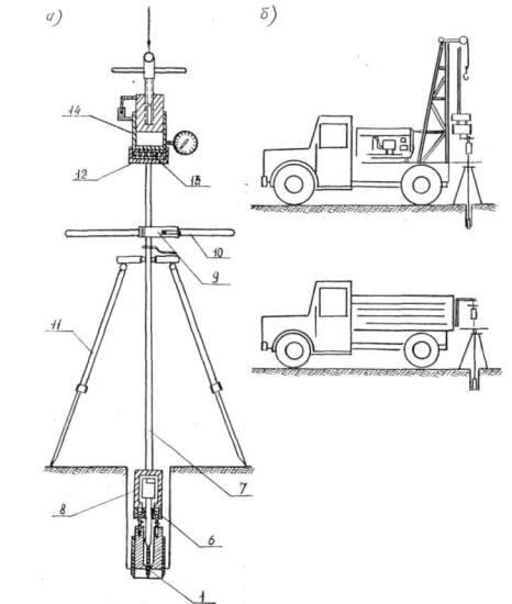 1 - крылъчатка; 2 - цилиндрическое кольцо; 3 - секторные штампы; 4 - пружины; 5 - направляющие стержни; 6 - опорная площадка; 7 - штанга; 8 - переходная муфта; 9 - динамометр; 10 - рукоятка; II - тренога; 12 - опорный стакан; 13 - упорный подшипник; 14 - домкрат