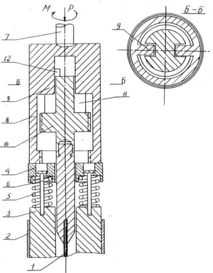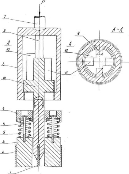 1 - крыльчатка; 2 - цилиндрическое кольцо; 3 - секторные штампы; 4 - опорная площадка; 5 - пружины; 6 - направляющие стержни; 7 - штанга; 8 - полый цилиндр; 9 - выступы; 10 - шток; 11 - пазы; 12 - секторные ограничители