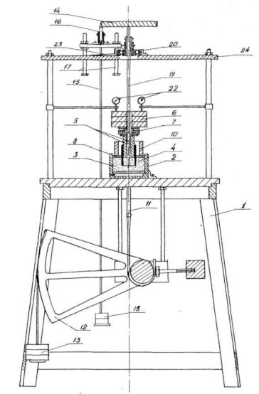 Прибор (рис. 5) состоит из: станины 1, контейнера 2 для грунта 3, крыльчатки одноповерхностного вращательного среза 4, секторных штампов 5, грузов 6 для создания нормального давления на поверхность среза грунта, упорно - радиального подшипника 7, штампа с центральным отверстием 8, которое может закрываться завинчивающейся пробкой 9 (рис. 6), кольцевого переходника 10, соединенного с силовой рамой 11, рычага 12, грузов для создания давления пригрузки 13, диска 14 с накрученным на него тросиком 15, роликов 16 с винтами 17, грузов 18 для создания крутящего момента, штанги 19 и радиального подшипника 20, мессур 21 и 22, нониуса 4 и столика 24 с лимбом для замера углов поворота крыльчатки.