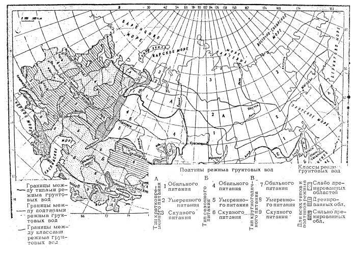 Тип режима сезонного питания (провинция Б)*) по признаку возможной величины питания подземных вод, определяемой разностью между атмосферными осадками, испарением и стоком, разделен на три подтипа: 1) обильного питания; 2) умеренного питания и 3) скудного питания. По этому признаку провинция Б разделяется на три зоны (рис 1,2, табл. 3): 1) зону обильного питания (4); 2) зону умеренного питания (5); 3) зону скудного питания (6); Таблица 3Зоны и подтипы режима грунтовых вод