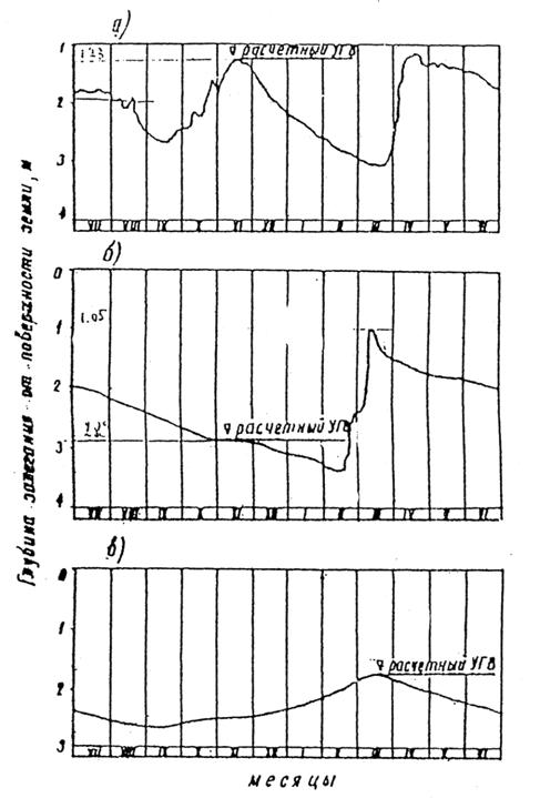 В зависимости от степени дренированности территории в подтипах режима выделены классы, а зоны разделены на области. В слабо дренированных областях подъем и спад уровня происходит плавно; в сильно дренированных колебания уровня более резкие но амплитуда колебаний меньше. *) Поскольку настоящие "Предложения" разработаны для районов с сезонным промерзанием грунтов (II, III, IV и частично V дорожно-климатической зоны), что примерно соответствует провинции Б, из дальнейшего рассмотрения исключены провинции А и В. Рис. 1. Карта районирования территории СССР по типам, подтипам и классам режима грунтовых вод (заимствована из книги А.А. Коноплянцева, В.С. Ковалевского, С.М. Семенова "Естественный режим подземных вод и его закономерности". М., Госгеолтехиздат, 1963) Рис. 2. Типовые графики годового цикла колебаний уровня грунтовых вод: а - зона обильного питания; б - зона умеренного питания; в - зона скудного питания. 8. Наиболее распространенной причиной увлажнения земляного полотна в районах с сезонным промерзанием при близком к поверхности земли залегании подземных вод является капиллярное поднятие в сочетании с перемещением пленочной влаги в процессе промерзания грунта. Интенсивность этих процессов зависит от взаимного положения границы промерзания и капиллярной каймы в грунте в период, когда промерзает земляное полотно. Зимнее влагонакопление в грунтах, склонных к пучинообразованию, может достигать весьма значительных величин при расположении капиллярной каймы в зоне промерзания. Вследствие наличия гидравлической связи с подземными, водами, влага капиллярной каймы перемещающаяся в зону промерзания, быстро восстанавливается. Многочисленными исследованиями и полевыми наблюдениями за водно-тепловым режимом земляного полотна установлено, что весенний подъем уровня подземных вод не влияет сколь-нибудь ощутимо, на состояние дорожной конструкции. При неглубоком залегании подземных вод весенний подъем имеет пикообразный характер и продолжительность его не превышает обычно 10-15 дней. За такой короткий срок, особенно в хорошо уплотненных связных грунтах, высота капиллярного поднятия крайне невелика. Отсюда следует, что состояние весной дорожной конструкции будет определяться в подавляющем большинстве случаев величиной зимнего влагонакопления. Таким образом, исходя из анализа годового цикла водно-теплового режима земляного полотна, наиболее опасным для устойчивости дорожной конструкции следует считать положение уровня подземных вод перед началом промерзания. Поэтому за расчетный уровень подземных вод при проектировании автомобильных дорог в районах с сезонным промерзанием грунтов предлагается принимать его наивысшее многолетнее положение перед началом промерзания грунта, что для значительной территории II дорожно-климатической зоны соответствует многолетнему осеннему максимуму. 9. В настоящее время еще не разработаны надежные методы, которые давали бы возможность на основании ограниченного количества признаков устанавливать положение расчетного уровня подземных вод в различных природных условиях. В связи с этим на практике приходится учитывать все многообразие природных факторов, чтобы установить наиболее близкое к действительному положение расчетного уровня. Перед началом изысканий уточняют климатические, поч