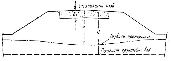 Н - глубина залегания расчетного уровня подземных вод (см. раздел II), считая от поверхности покрытия по оси проезжей части (рис. 4), см; Z1 - общая толщина одежды и морозозащитного слоя, см; Z - расчетная глубина промерзания дорожной конструкции, считая от поверхности покрытия по оси проезжей части (см. приложение 2), см; αв - показатель, учитывающий особенности климатических условий, см2/сутки;