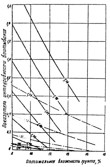 Показатель интенсивности впитывания определяют по формуле: где K - коэффициент фильтрации грунта, м/сутки, определяемый в лаборатории на приборе Ф-1 м; WT - влажность грунта, .соответствующая границе текучести, %; Wопт - оптимальная влажность грунта, %; Wп.в - полная влагоемкость, %, определяемая по пробе грунта, подвергавшейся испытанию на фильтрацию. *) Таблица 7 и формула (7) предложены В.И. Рувинским. Ориентировочные значения С можно получить также по графику рис. 6 в зависимости от плотности и оптимальной влажности грунта. Общее количество воды, поступающей за сутки на 1 пог. м дороги в основание проезжей части на участках с однообразными продольными уклонами, определяют в соответствии с Указаниями /2/ по формуле: где q1 - количество воды освобождающееся при оттаивании переувлажненного грунта под проезжей частью; q2 - то же, при оттаивании грунта под обочинами; q3 - количество воды, проникающее с поверхности дороги в основание от атмосферных осадков.