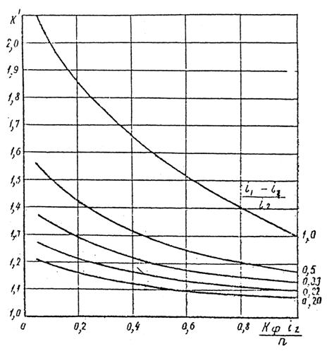 Рис. 6. График для определения показателя интенсивности впитывания. Цифры на кривых – объемный вес скелета грунта, г/см3 При вогнутых переломах продольного профиля количество воды, поступающей за сутки в основание может быть определено по формуле: где K' - коэффициент, учитывающий накопление воды у перелома продольного профиля. Величину коэффициента K' находят по номограмме рис. 7 в зависимости от отношений (i1–i2)/i2 (кривые на номограмме) и (Kф·i2)/n (горизонтальная ось), где Kф - коэффициент фильтрации уплотненного до стандартной плотности материала дренирующего слоя, м/сутки; n - пористость материала в долях единицы; i1 и i2 - продольные уклоны участков выше и ниже перелома продольного профиля*).