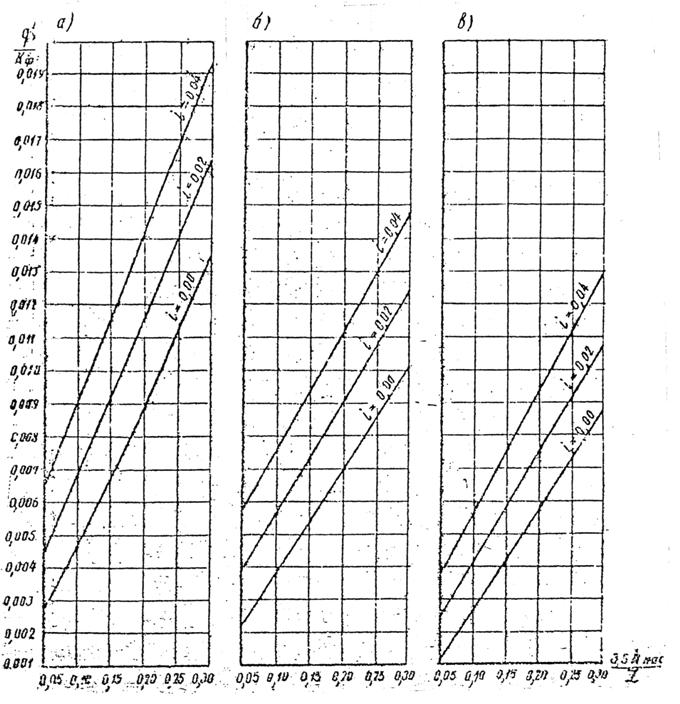 Рис. 7. Номограмма для расчета коэффициента накопления воды в дренирующем слое в местах, вогнутых переломов продольного профиля *) номограмма (рис. 7) построена для продольных уклонов одинакового направления. 2. Опыт проектирования показал, что толщина дренирующего слоя из материала с коэффициентом фильтрации Kф≤4 м/сутки, удовлетворяющая требованию своевременного отвода воды, обеспечивает и временное размещение воды в период, когда водоотводящие устройства не работают; толщина дренирующего слоя из материала с Kф≥4 м/сутки, рассчитанная по условию временного размещения воды, обычно обеспечивает отвод воды после оттаивания дрен. Поэтому расчет толщины дренирующего слоя ведется в зависимости от величины Kф. а) При использовании материала с Kф≤4 м/сутки расчет следует вести с помощью номограммы рис. 8 на своевременный отвод воды, поступающей за сутки. Рис. 8. Номограмма для расчета дренирующего слоя: а - мелкий песок; б - песок средней крупности; в - крупный песок. Сначала определяют отношение q'/Kф, где q'=0,5q, найденного по формуле (8), или q' = 0,5qвогн, найденного по формуле (9), при двухскатном поперечном профиле проезжей части и q' = q (или q' = qвогн) - при односкатном. Затем для данного отношения q'/Kф (вертикальная ось) с учетом поперечного уклона грунтового основания i (кривые на номограмме) определяют толщину слоя дренирующего материала, полностью насыщенного водой hнас (горизонтальная ось). Номограмма построена для пути фильтрации воды в дренирующем слое Z = 3,5÷3,75. Это соответствует случаю, когда приемная часть дрен находится у краев двухскатной проезжей части шириной 7,0-7,5 м. При иной ширине проезжей части, а также при устройстве сплошного дренирующего слоя под обочинами, когда путь фильтрации равен Z1, величину h'нас находят из равенства: