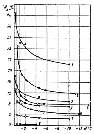 Рис. 1. Содержание незамерзающей воды в грунтах (по данным З.А. Нерсесовой, О.С. Конновой и В.О. Орлова):