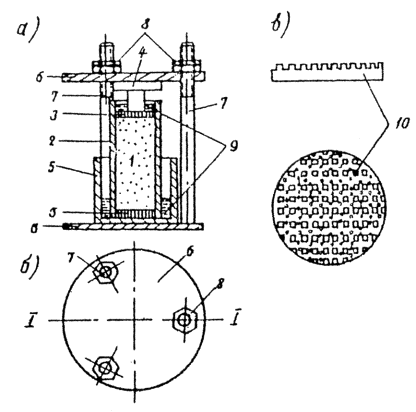 1 - грунтовый цилиндр; 2 - стенка формы; 3 - днища формы (вкладные); 4 - упор; 5 - металлический сосуд для воды; 6 - пластины зажима; 7 - стойки зажима; 8 - гайки с контргайками; 9 - вода; 10 - прорези с отверстиями в днищах для прохода воды.