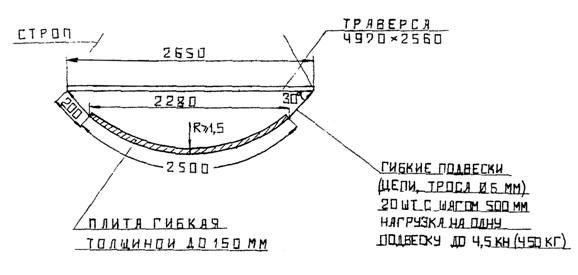 1.14. Применение в качестве арматуры новых, в том числе импортных, арматурных сталей допускается только при условии обязательной приемочной проверки, независимо от наличия сертификатов, включающей механические испытания, оценку пластичности металла, оценку свариваемости. 1.15. Допускаемые отклонения при заготовке арматуры должны соответствовать приведенным в СНиП III-43-75. 1.16. Арматурные изделия и закладные детали должны удовлетворять требованиям ГОСТ 10922-75. 1.17. Для оболочек пластической связи рекомендуется использовать полиэтилен высокой плотности (низкого давления) по ГОСТ 16338-85Е. Следует использовать комбинации на основе полиэтилена базовых марок 20708-016 или 20808-024 с термо-, фото- и антикоррозионными добавками в соответствии с рецептурой 11, 12, 20, первого сорта черного цвета. Для конструкций, которые после монтажа будут эксплуатироваться в защищенных от прямых солнечных лучей условиях, в том числе под слоем воды толщиной не менее 0,5 м, допустимо также применение рецептур 03, 13, 17, 22, 23, 58. При заказе следует указывать полиэтилен 207-а черный 901, сорт 1 ГОСТ 16338-85E, или 208-а черный 901, сорт 1 ГОСТ 16338-85E, где а - номер упомянутых рецептур. 1.18. При изготовлении гибких железобетонных плит следует соблюдать требования СНиП III-4-80, правил безопасности по эксплуатации оборудования, а также действующих на заводе МЖБК инструктивных указаний по технике безопасности и охране труда. 1.19. Все гибкие плиты, поставляемые потребителю, должны иметь маркировку в соответствии с ГОСТ 13015.2-81. 1.20. Плиты на технологических операциях при изготовлении, транспортировании и монтаже перемещаются при помощи специальных траверс. Их размер определен исходя из геометрических размеров и допустимых деформаций строительной конструкции, а также удобства работы с траверсой на грузоподъемных операциях, рис. 2. 2. правила приемки2.1. Приемка работ производится в соответствии с ГОСТ 13015.1.81, СНиП III-43-75 и настоящими техническими условиями. 2.2. Плиты до отправления их из цеха предприятия на склад должны пройти операционный и приемочный контроль, выполняемый силами ОТК и лабораторией предприятия и должны быть приняты заводской инспекцией. 2.3. После приемки готовой продукции плиты маркируются в соответствии с указаниями настоящих технических условий. 2.4. Плиты принимаются партиями. На каждую партию составляется документ о качестве в соответствии с ГОСТ 13015.3-81. 3. МЕТОДЫ КОНТРОЛЯ3.1. Контроль качества гибких плит осуществляется в соответствии с требованиями СНиП III-43-75, ГОСТ 13015.1-81 и настоящих технических условий. 3.2. Контроль качества изготовления гибких плит должен осуществляться производственно-техническим персоналом завода, заводской лабораторией, заводской инспекцией, представителями заказчика, а в особых случаях представителями проектной организации. Результаты контроля вносятся в специальный журнал. Операционный и приемочный контроль производится для каждой партии плит в соответствии с ГОСТ 18105.0-80 и ГОСТ 18105.1-80. 3.3. Контроль прочности бетона производится для каждой партии плит в соответствии с ГОСТ 18105.0-80 и ГОСТ 18105.1-80. Контрольные испытания бетона на морозостойкость следует производить в соответствии с ГОСТ 10060-76. 3.4. Контроль арматурной стали осуществляется в соответствии с ГОСТ 5781-82. 4. ТРАНСПОРТИРОВАНИЕ И ХРАНЕНИЕ4.1. Складирование гибких плит должно производиться штабелями, в