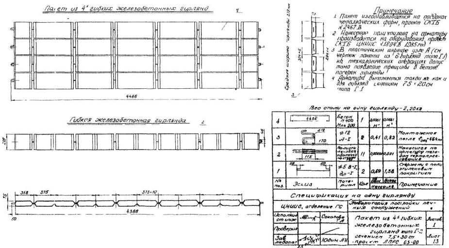 Настоящие технические условия (ТУ) распространяются на гирлянды железобетонные гибкие сборные типа Г-1 и типа Г-2, из которых собираются блоки решетчатых гибких покрытий, применяемых для защиты откосов земляных сооружений от воздействия водной среды. Конструкторская документация на гирлянды ж.б. гибкие сборные разработана Всесоюзным научно-исследовательским институтом транспортного строительстве (ЦНИИС) по проекту ЛРС № 61-00. Пример условного обозначения при заказе: гирлянда железобетонная Г-1 ТУ 218 УССР 56-87. 1. ТЕХНИЧЕСКИЕ ТРЕБОВАНИЯ1.1. Гирлянды железобетонные гибкие сборные должны соответствовать требованиям настоящих технических условий и комплекта документации, разработанных ЦНИИСом, проект № 62-00 № 63-00. 1.2. Гирлянды железобетонные сборные Г-1 и Г-2 изготавливаются поточно-постовым способом на заводе стройиндустрии. Основные размеры и отклонения от проектных размеров гирлянд и элементов гирлянд указаны в табл. 1 и табл. 2. Размеры гирлянд в мм