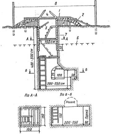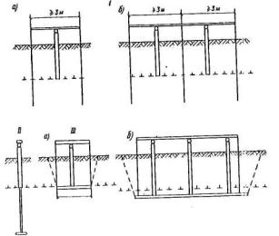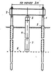 Рис. 36. Схемы анкерных опор Установка обычно оборудуется приспособлениями и приборами для измерения перемещений грунта вблизи фундамента, температуры и глубин его промерзания. 4.286. При проектировании конструктивных элементов установки необходимо учитывать следующие требования: все элементы установки следует рассчитывать на действие ожидаемых касательных сил пучения с учетом возможного их превышения в 1,5-2 раза; за силы, удерживающие анкерную опору в грунте, следует принимать силы смерзания (при наличии вечномерзлых грунтов сливающегося типа), определяемые по главе СНиП II-Б.6-66 (п. 5.7, табл. 5), или силы трения, определяемые по главе СНиП II-Б.6-66 (п. 5.17); если анкерная опора установки выполняется с уширением в нижней части в виде башмака, плиты и т. п., то ее следует рассчитывать на выдергивание, руководствуясь п. 6.16 главы СНиП II-И.9-62 «Линии электропередачи напряжением выше 1 кв. Нормы проектирования» и принимая коэффициент условий работы равным 1; опытный фундамент следует выполнять в виде одиночной опоры, боковая поверхность которой должна иметь такую же шероховатость, что и у фундаментов проектируемых сооружений; упорные элементы опытной установки необходимо проектировать с таким расчетом, чтобы их деформации, а следовательно и максимальное перемещение опытного фундамента, были минимальными и не превышали 5-6 мм; для измерения сил пучения следует использовать: стандартные пружинные динамометры, динамометрические кольца и другие силоизмерительные приборы. Жесткость динамометров должна быть возможно большей, а верхний их предел измерений должен назначаться исходя из ожидаемых сил пучения с учетом возможного их превышения в 1,5-2 раза. МОНТАЖ УСТАНОВОК 4.287. Погружение анкерных опор в вечномерзлый грунт производится в лидерные скважины, проходимые виброударным способом или бурением. В пластичномерзлые и высокотемпературные грунты анкерные опоры забиваются непосредственно дизель-молотами или вибро-ударными установками. Лидерная скважина устраивается несколько большего диаметра, чем диаметр анкерной стойки. После установки опоры свободное пространство скважины заливается разжиженным грунтом (шламом). 4.288. При необходимости искусственного охлаждения вечномерзлых грунтов после установки анкерных опор нижнюю часть скважины заливают ледосоляной эвтектической смесью или вентилируют через внутреннюю полость опоры холодным наружным воздухом. 4.289. Установку анкерных опор в лидерные скважины завершают за 2-3 месяца до начала сезонного промерзания грунтов. 4.290. Анкерные опоры, имеющие уширение в нижней части в виде башмака или плиты, устанавливают в шурф или котлован. Анкерные опоры с уширением используются на участках, где вечномерзлые грунты в основании отсутствуют или залегают на большой глубине (8-10 м). 4.291. Погружение в грунт опытного фундамента должно производиться по аналогии с проектными предложениями по производству фундаментных работ. ПРОВЕДЕНИЕ ИСПЫТАНИЙ 4.292. При испытаниях касательных сил пучения грунтов фиксируют: величину пучения грунта около фундамента; глубину промерзания и температуру грунта; температуру воздуха; уровень грунтовых вод (при наличии вечномерзлых грунтов несливающегося типа или при сезоннопромерзающих грунтах); влажность грунта. Регулярно контролируется устойчивость анкерных опор и опытн