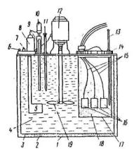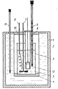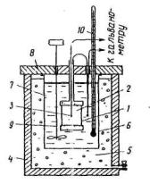 Рис. 4. Схема калориметра В центре оболочки калориметра на подставке из изоляционного материала помещается латунный никелированный калориметрический стакан диаметром 100 мм, высотой 200-210 мм; сверху его закрывают крышкой из эбонита, в которой закреплены пропеллерная мешалка (размер лопастей ~4 см) для перемешивания калориметрической жидкости, жесткая латунная сетка для бюкса с мерзлым грунтом и нагреватель для определения теплового значения калориметра. В крышке имеется отверстие для термометра Бекмана. Калориметрическая жидкость - обычно дистиллированная вода; в случае проведения опыта при температуре ниже 0°С - спирт. 2.18. Калориметрический стакан, термометр Бекмана, нагреватель, сетка для образца и мешалка должны быть сухими. Взвешивание воды для опыта производят непосредственно в калориметрическом стакане; вес воды определяют по разности весов калориметрического стакана с водой и без воды (в сухом состоянии). Вес воды берут постоянным, например 1200 или 1000 г, и для этого же количества воды определяют тепловое значение калориметра. Перед взвешиванием температуру воды в калориметрическом стакане доводят до значения на 0,5-1° выше, чем температура воды в оболочке калориметра, добавлением теплой или холодной воды; затем взвешивают калориметрический стакан с водой на технических весах с точностью до 0,01 г, ставят его на подставку и закрывают сверху крышкой с вмонтированными в нее нагревателем, мешалкой и сеткой. В крышку вставляют термометр Бекмана таким образом, чтобы нижняя часть его не менее чем на 10 см была погружена в калориметрическую жидкость; это устанавливают предварительно и делают отметку на термометре Бекмана. Примечание. Температура воды в параллельных опытах не должна отличаться более чем на 0,5°. 2.19. Шкала термометра Бекмана (рис. 5) имеет условный характер, так как при различном наполнении ртутью основного резервуара каждый 1° его шкалы имеет различное значение. Для перевода разности температуры, установленной по этому термометру, к действительному значению разности температуры нужно ввести поправку на «значение градуса», которая дается в паспорте термометра Бекмана. Цена деления шкалы термометра Бекмана равна 0,01°, при работе с лупой точность отсчета составляет ~ 0,002°. Установку положения ртути в термометре Бекмана на желаемый интервал температур производят перед опытом следующим образом: термометр Бекмана поворачивают верхней частью вниз и легким постукиванием ртуть из главного резервуара приводят в соприкосновение с ртутью в дополнительном резервуаре; затем, осторожно повернув термометр главным резервуаром вниз, помещают его в воду с температурой, близкой к заданной; при этом следует следить за тем, чтобы столбик ртути в дополнительном капилляре не разорвался; выждав несколько минут, резко встряхивают термометр, чтобы ртуть в дополнительном капилляре упала на дно, и проверяют положение ртути в термометре.