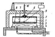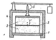 ОПРЕДЕЛЕНИЕ ТЕПЛОПРОВОДНОСТИ ГРУНТА НА ОБРАЗЦЕ МАЛОГО РАЗМЕРА 3.71. Теплопроводность грунта на образцах малого размера, например, типа керна буровой скважины определяют по упрощенной методике, основанной на закономерности регулярного теплового режима. Методика применима для исследования влажных талых грунтов песчано-глинистого состава с размером включений до 5 мм, а также мерзлого грунта того же состава массивной или мелкослоистой криогенной текстуры с толщиной ледяных включений менее 2 мм при температуре не выше -10° С. В состав испытания образца грунта для нахождения коэффициента теплопроводности этим методом входит независимое калориметрическое определение его теплоемкости. ПРИБОРЫ 3.72. Прибор для определения коэффициента теплопроводности грунта по методу регулярного теплового режима основан на свободном охлаждении или нагревании образца в среде постоянной температуры. В опыте наблюдают за изменениями температуры во времени. Схема прибора показана на рис. 10.